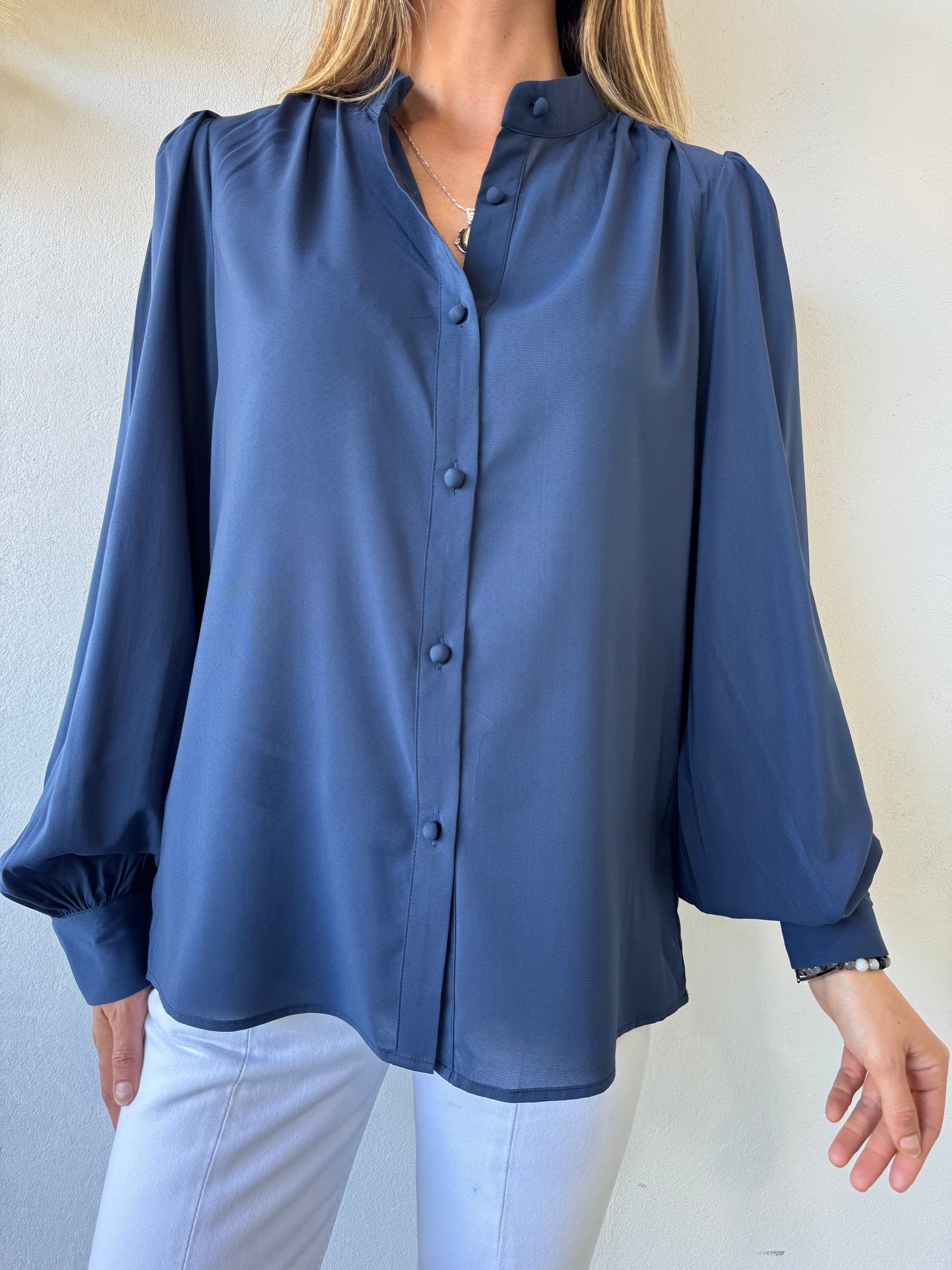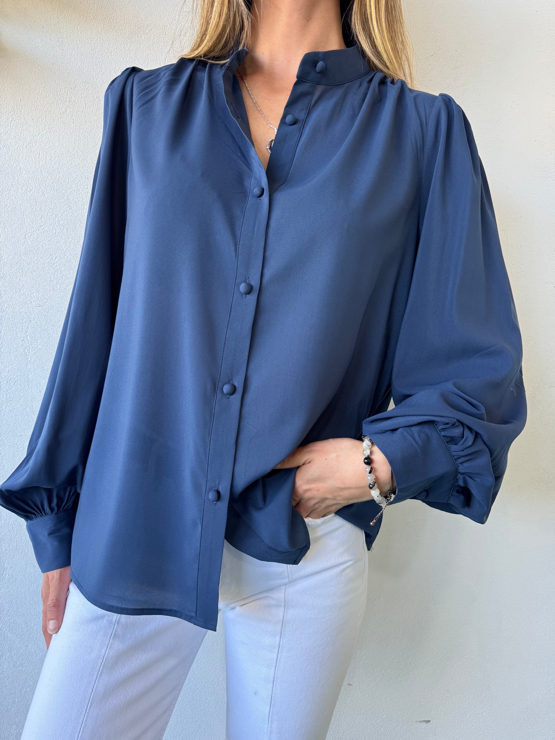 🌿 Blusa sofisticada en azul marino, con cuello alto, botones al frente y mangas abullonadas que añaden un toque elegante. Su diseño fuido es perfecto para un look formal o casual chic. Ideal para combinar con pantalones claros o falda.
