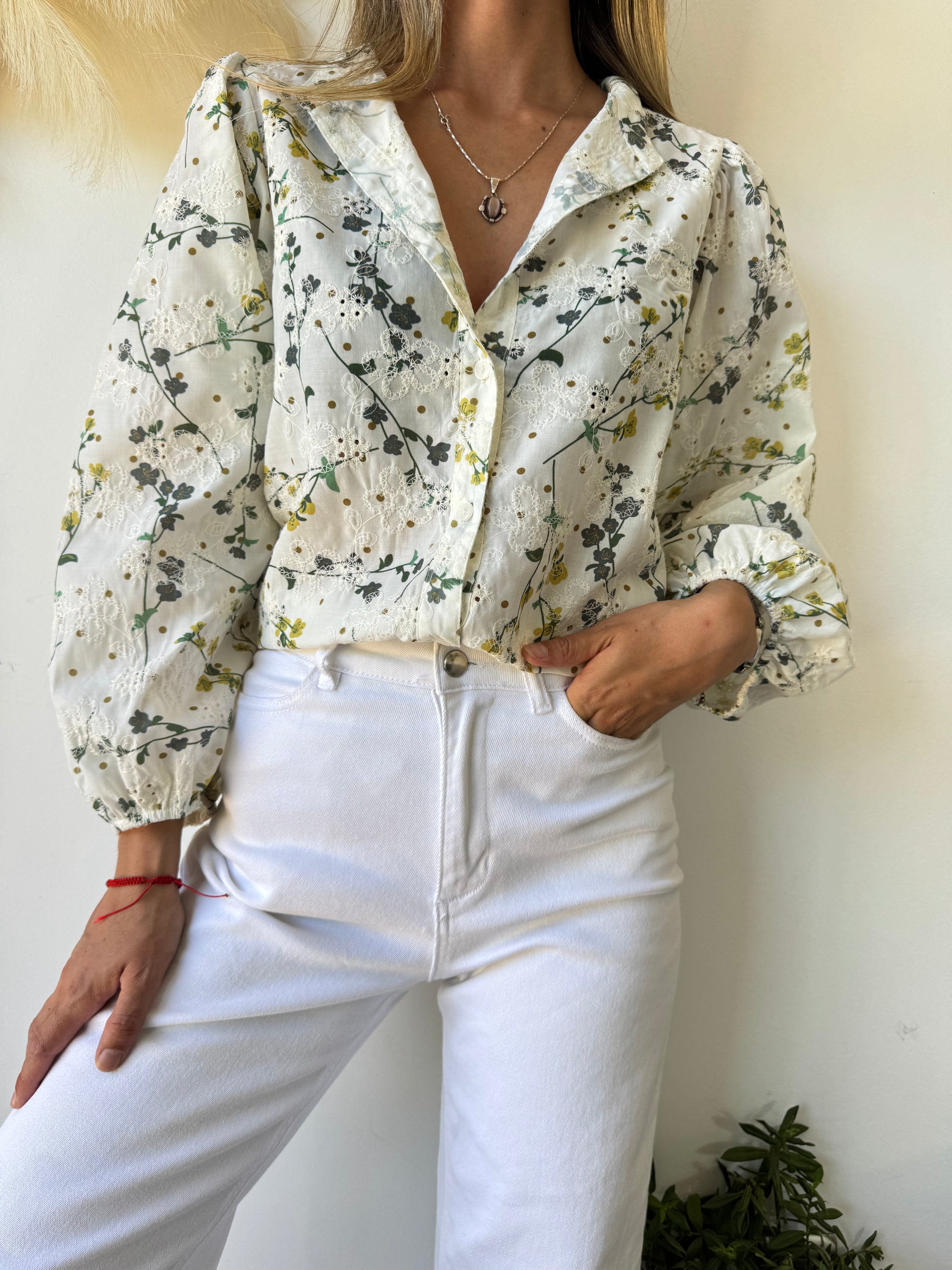 🌿 Blusa delicada y romantica con estampado floral en tono verdes y amarillos, complementada con detalle bordados que realzan su diseño. Incluye botones frontales y mangas abullonadas que le aportan un toque moderno y fresco.