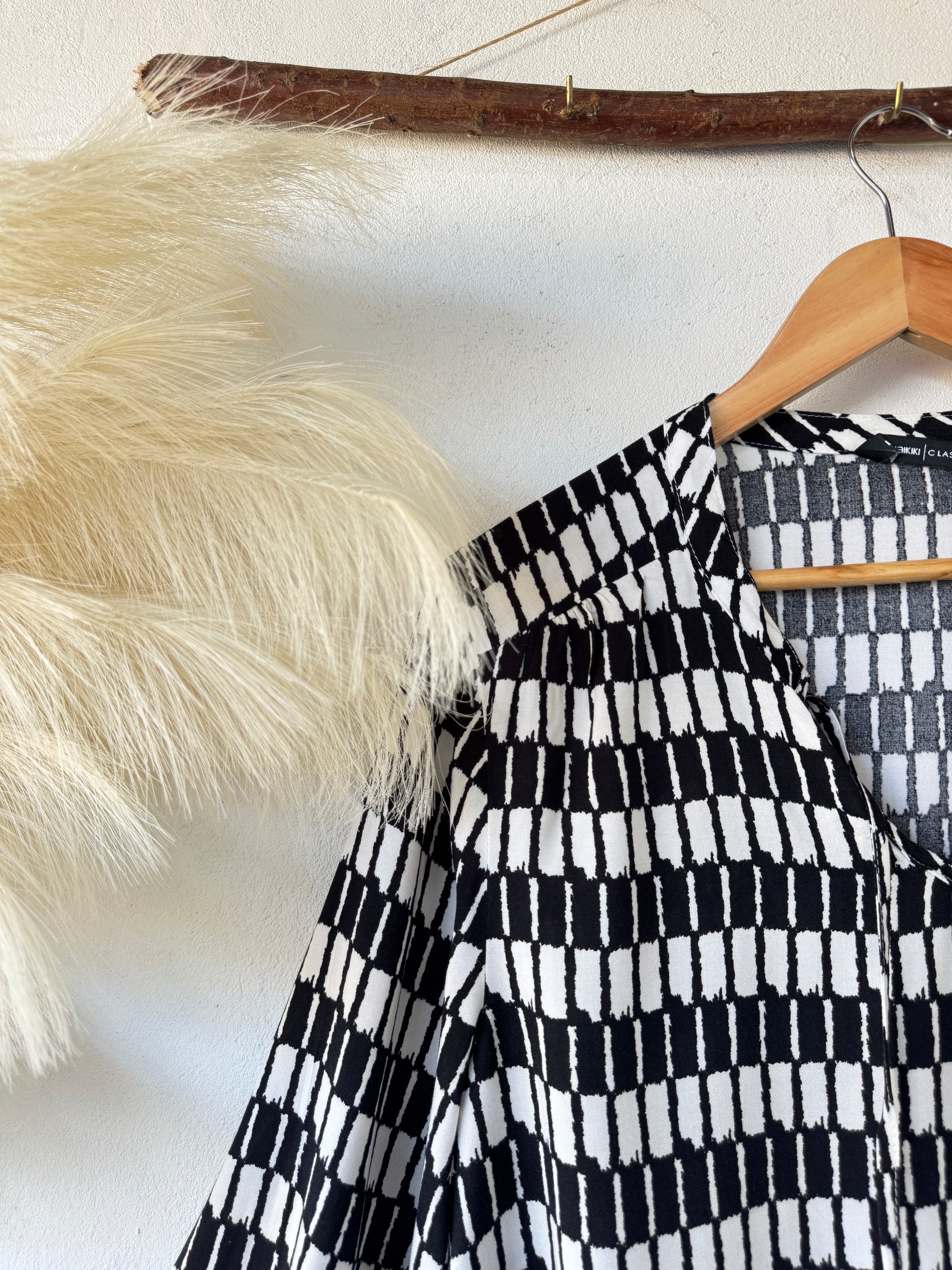 🌿 Blusa moderna con un estampado geométrico en blanco y negro, escote en V con detalle de lazos y mangas largas ajustables. Su diseño fluido y versátil es perfecto para un look casual o elegante.