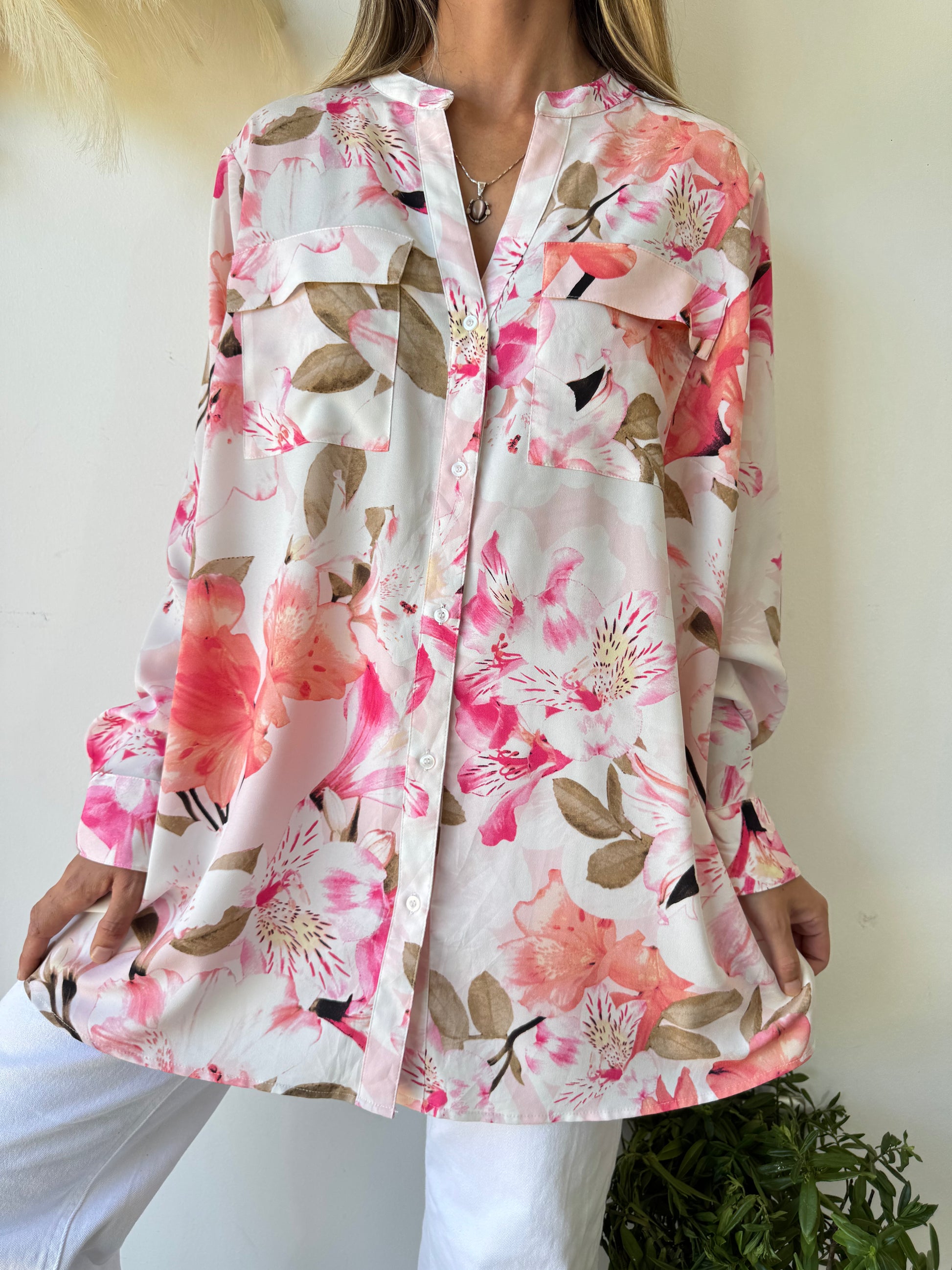 🌿 Blusa ligera y femenina con un delicado estampado floral en tonos rosados y beige. Su diseño incluye cuello mao, botones frontales y bolsillos decorativos en el pecho, añadiendo un toque moderno