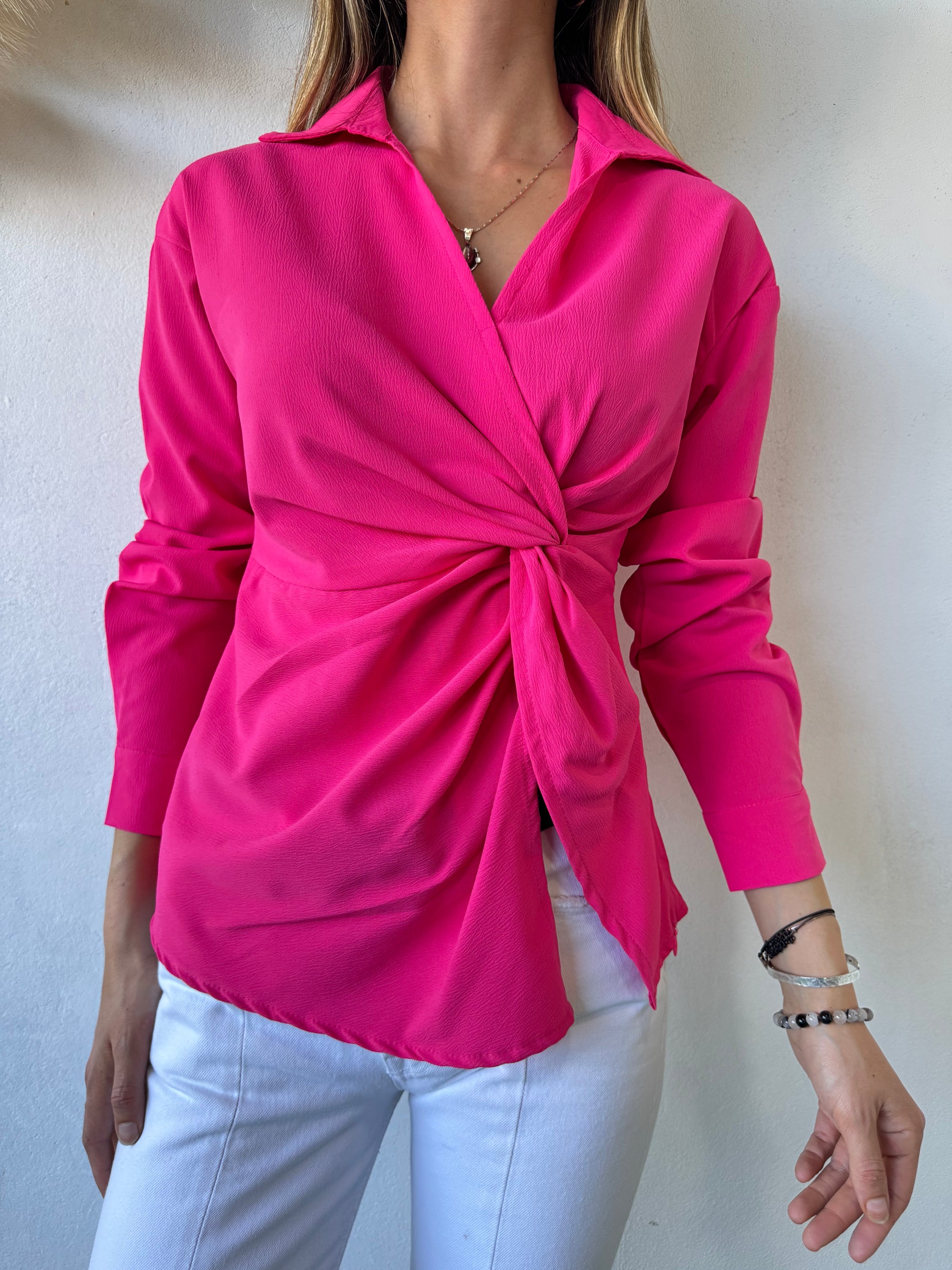 🌿 Blusa vibrante en color fucsia, con cuello camisero y un elegante detalle de nudo frontal que resalta la silueta. Su diseño único y ajustado en la cintura la convierte en la prenda perfecta para un look sofisticado y moderno. Ideal para destacar en cualquier ocasión.