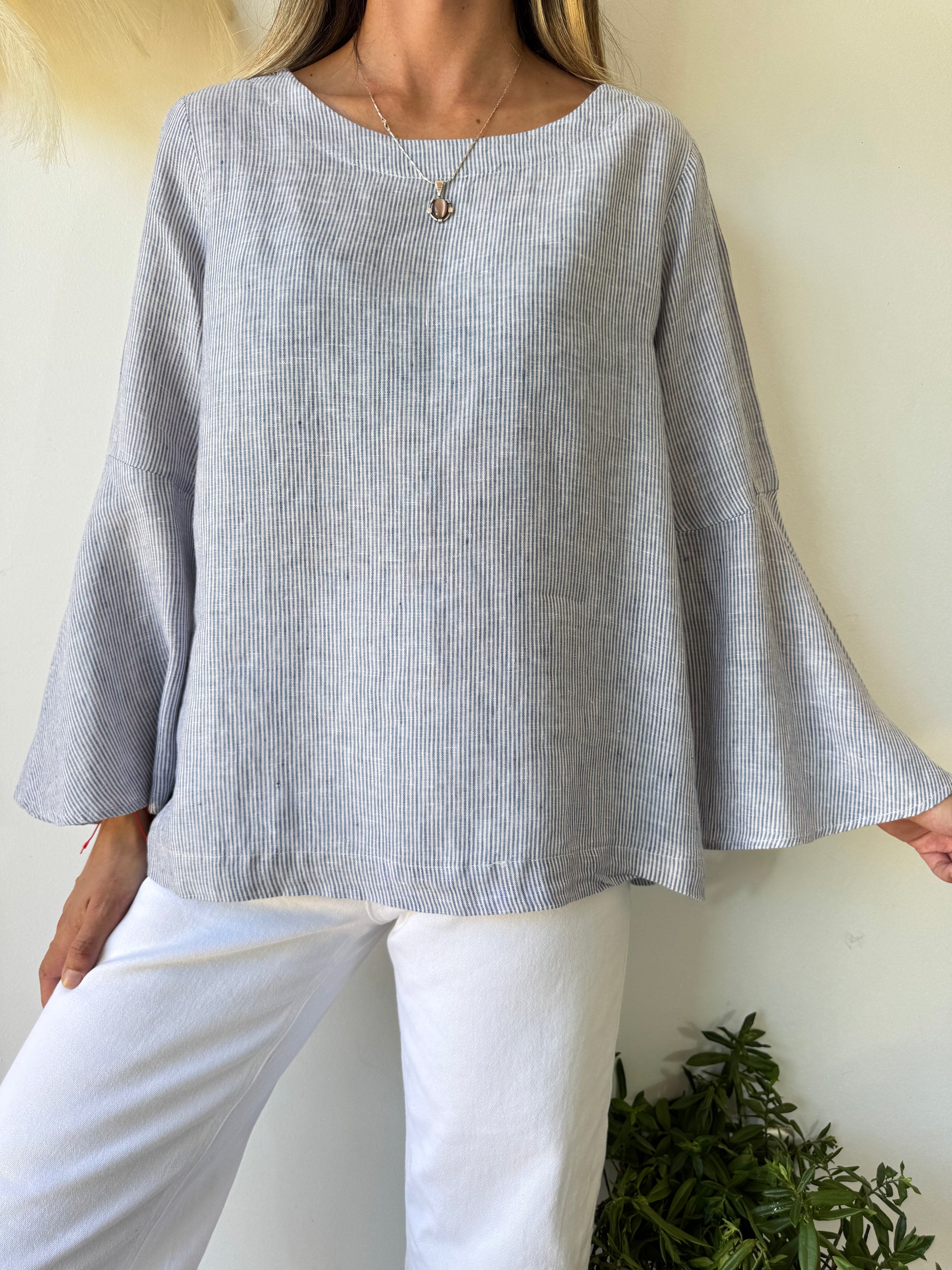 🌿 Blusa confeccionada en lino 100%, fresca y ligera, ideal para dias cálidos. Su diseño minimalista en color gris con finas rayas y mangas amplias aporta un toque bohemio y sofisticado. Perfecta para un look relajado y elegante.