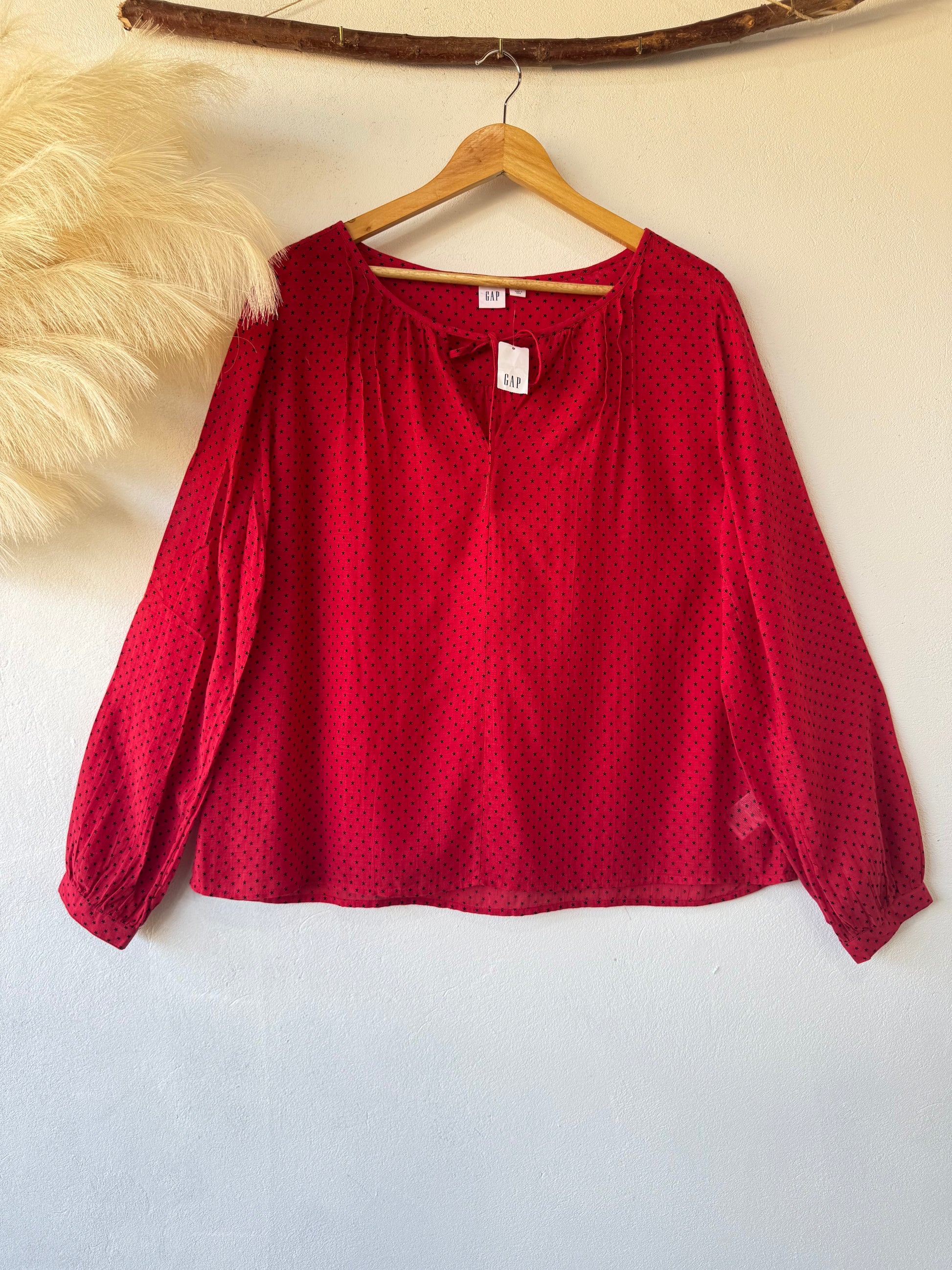 🌿 Blusa roja con un delicado estampado de estrellas negras, escote en V con lazos decorativos y mangas largas. Su tela ligera y diseño fluido la hacen ideal para un look casual y femenino. Perfecto para combinar con jeans o pantalones blancos.