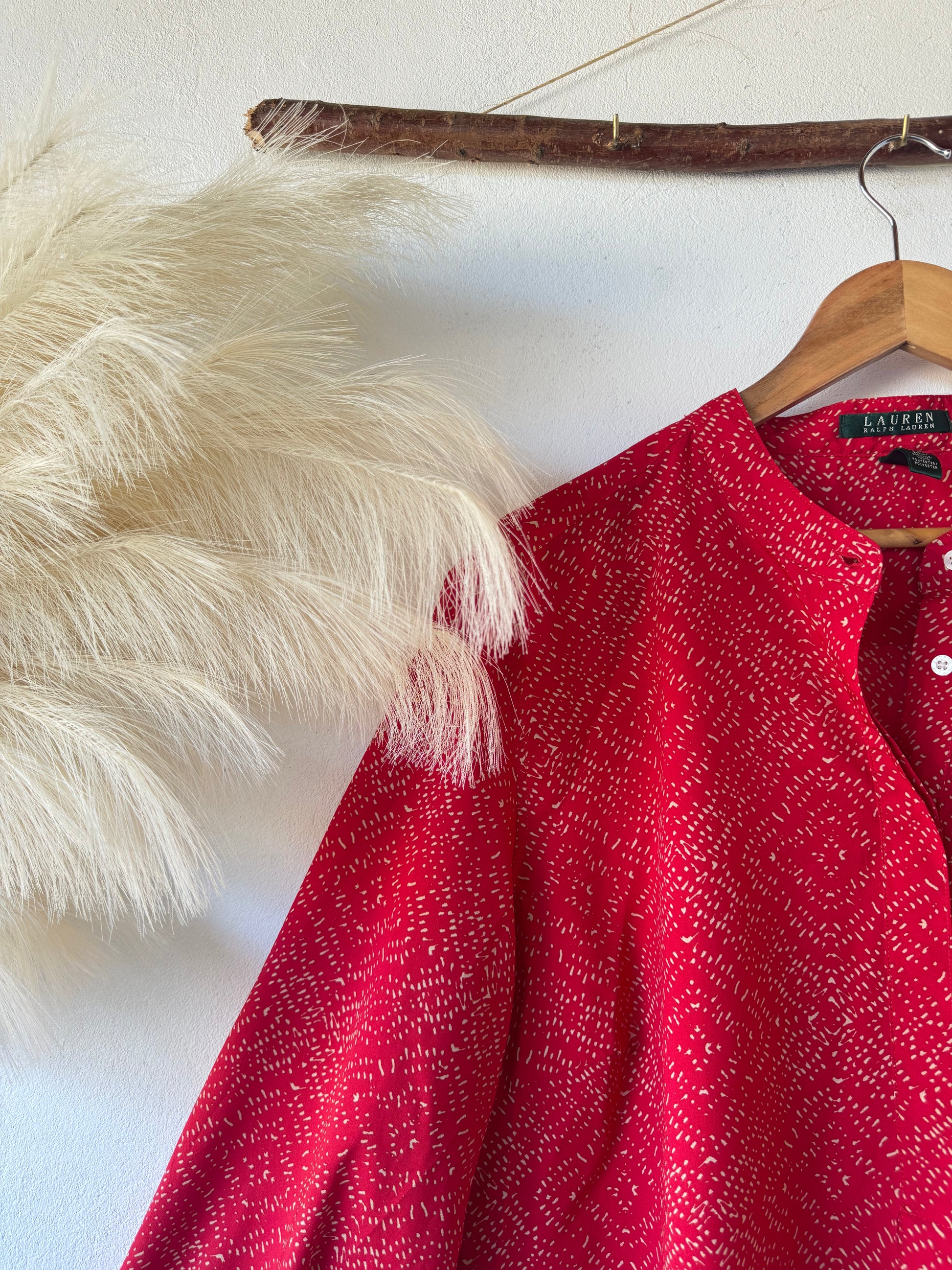 🌿Blusa vibrante en tono rojo con un sutil estampado minimalista en blanco. Su diseño fluido, cuello mao y cierre con botones frontales aportan un toque elegante y moderno
