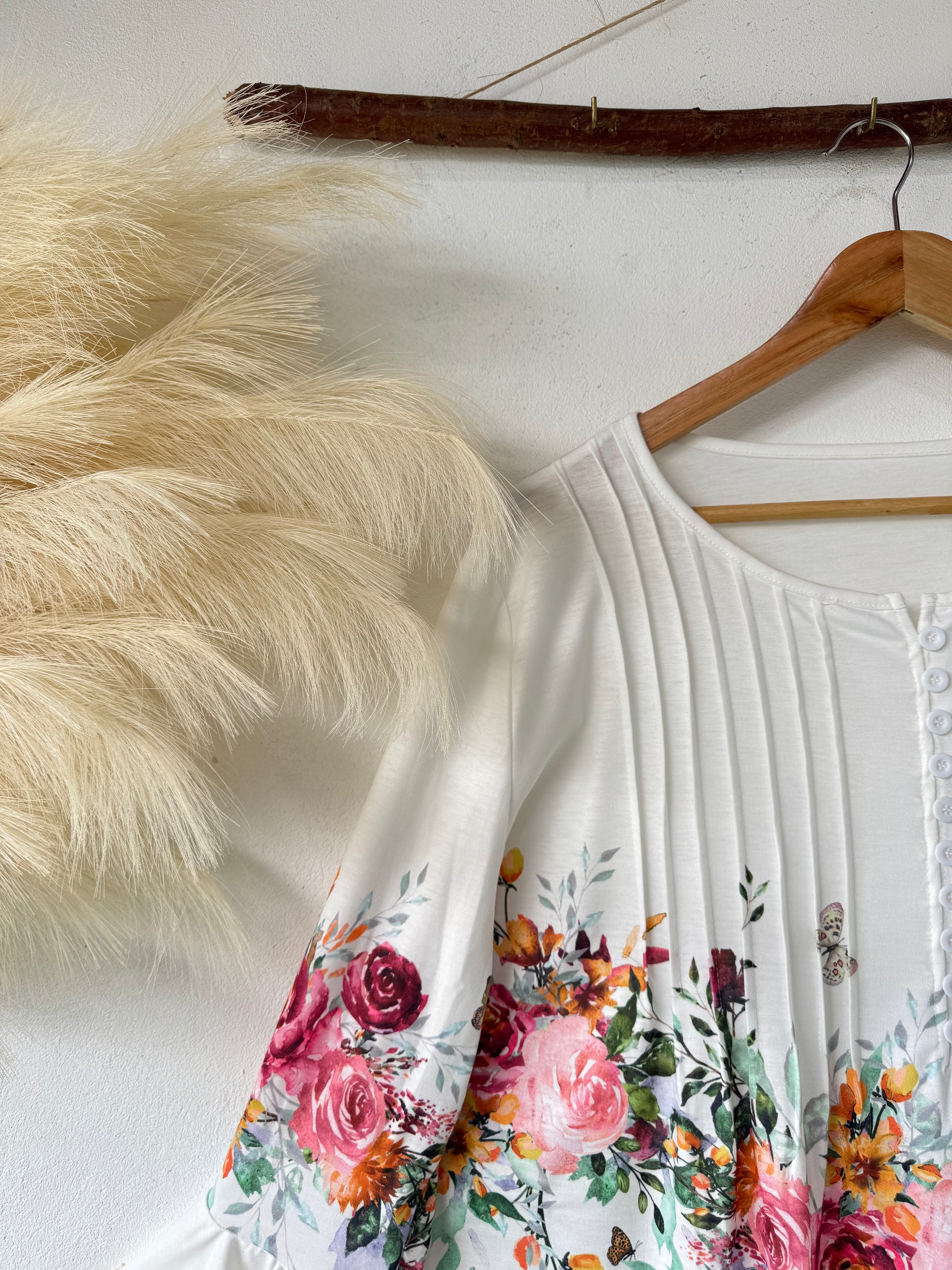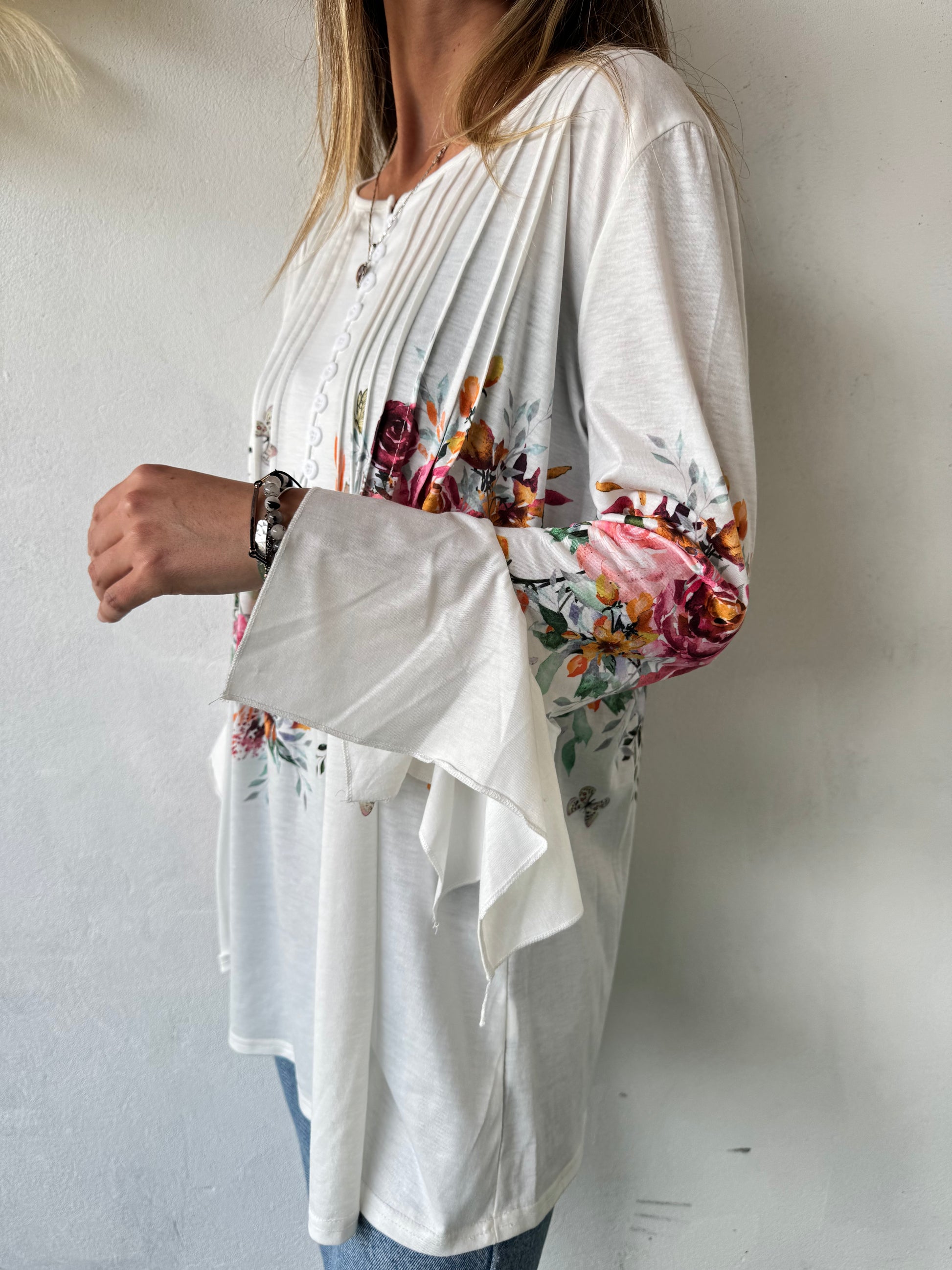 🌿 Polera diseño floreado caida holgada y mangas acampanadas.